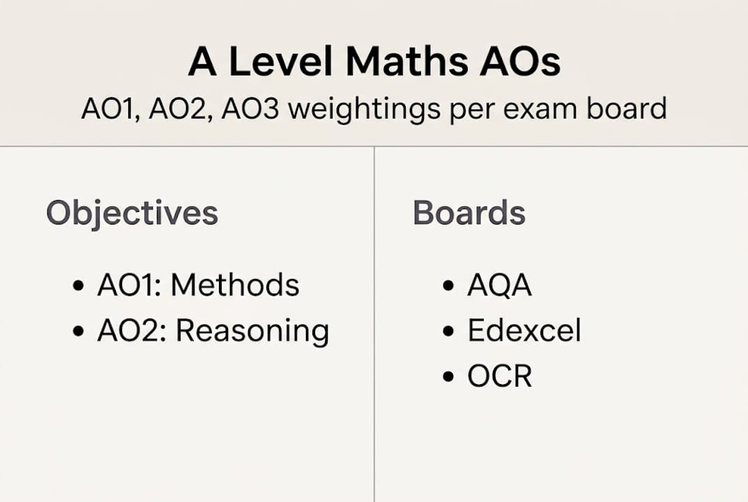 An assessment objective is a formally defined category of mathematical skill that exam boards use to structure their questions and mark schemes. Rather than testing maths as one undifferentiated block, boards like AQA, Edexcel, OCR, and CIE divide the skills they assess into distinct categories. This means every mark on your paper is assigned to a specific AO before you even sit down to write.