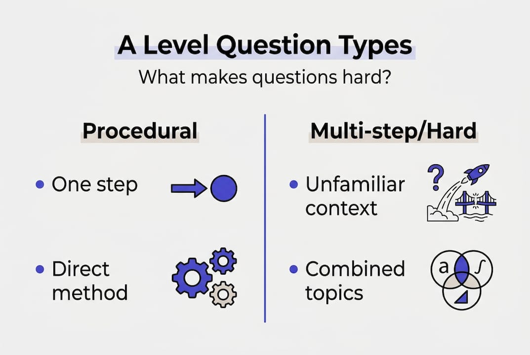 The MATH taxonomy confirms that school-level exams sit at roughly 70 to 90% Group A questions, whilst university-level work shifts to around 50% Group C. A Level sits in between, building steadily toward those harder multi-step applications. Top student advice consistently highlights that planning your method before writing anything down is essential for multi-step questions.