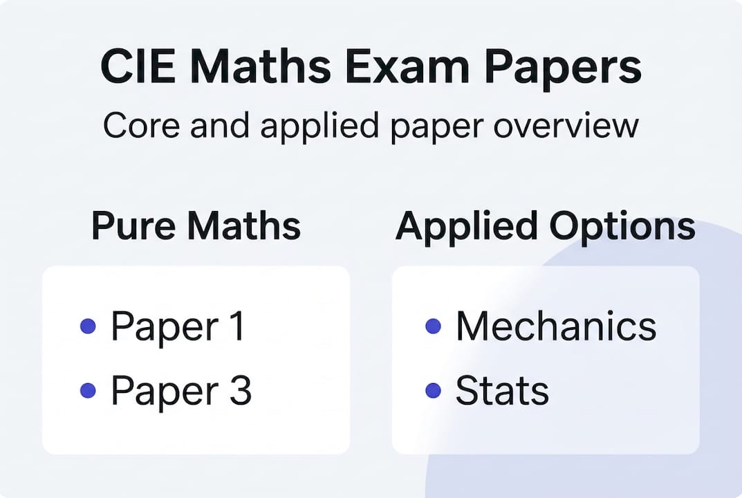 The 9709 qualification requires you to sit Pure Mathematics Papers 1 and 3, alongside one Applied paper chosen from Mechanics (Paper 4), Probability & Statistics 1 (Paper 5), or Probability & Statistics 2 (Paper 6). The Pure papers are compulsory for every candidate. Your Applied choice depends on your school's offering or your own preference, though most students take either Mechanics or Statistics 1.