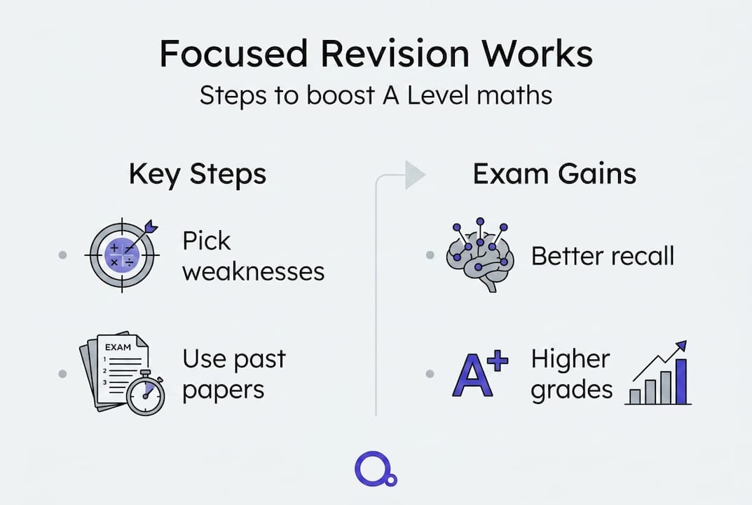 Research shows you can improve A Level maths scores by 15 to 20% with focused revision compared to random study. The improvement comes from directing effort at your actual gaps rather than comfortable material.