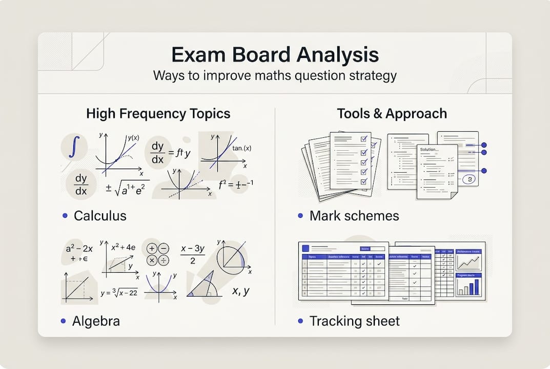 The top frequent topics across Edexcel and Cambridge follow a consistent pattern: calculus, algebra and functions, trigonometry, vectors, and coordinate geometry dominate pure maths, while kinematics and forces lead in mechanics. Reviewing AQA board trends alongside your own board gives you a broader picture of where examiners consistently focus their attention.
