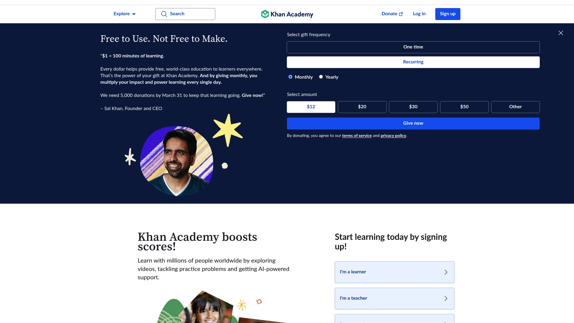 Khan Academy is free to use and funded through donations, allowing full access to core content at no charge to learners or institutions.