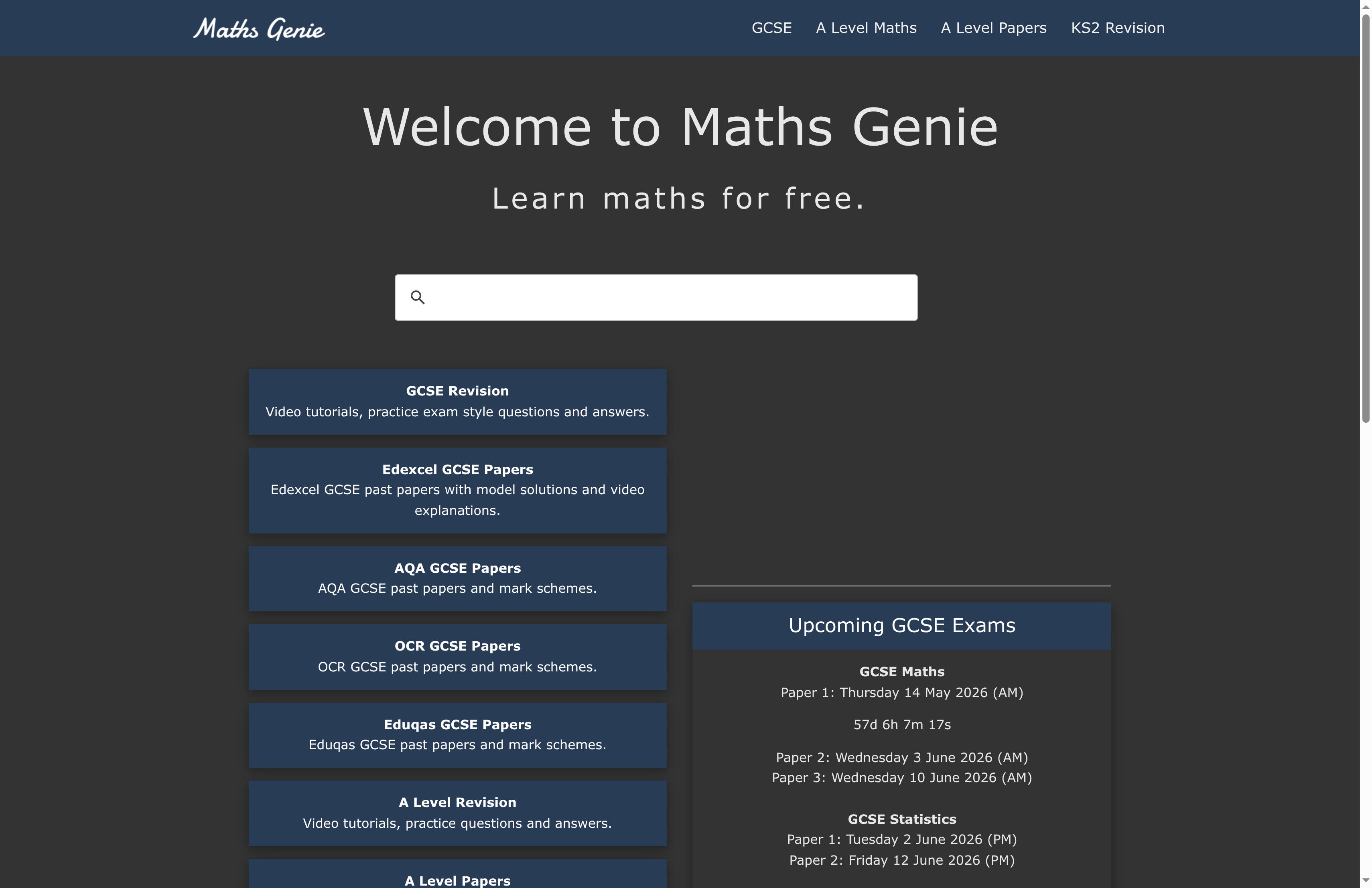 Maths Genie offers video tutorials for GCSE and A Level, organised past papers from major exam boards, and worked solutions for practise questions. The site includes predicted papers and mini tests for revision and materials for KS2 and IGCSE levels to support progressive study.