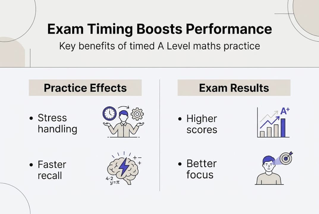 | Consistent timing builds confidence | Regular timed practice develops resilience and reduces anxiety for your real A Level maths exam. |